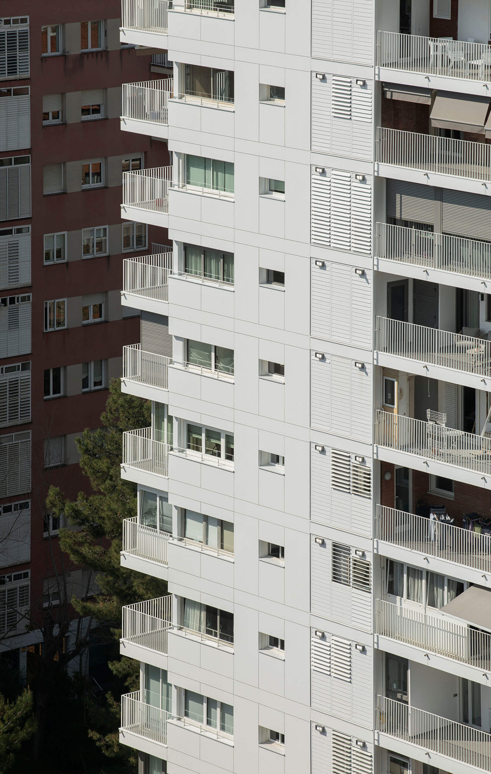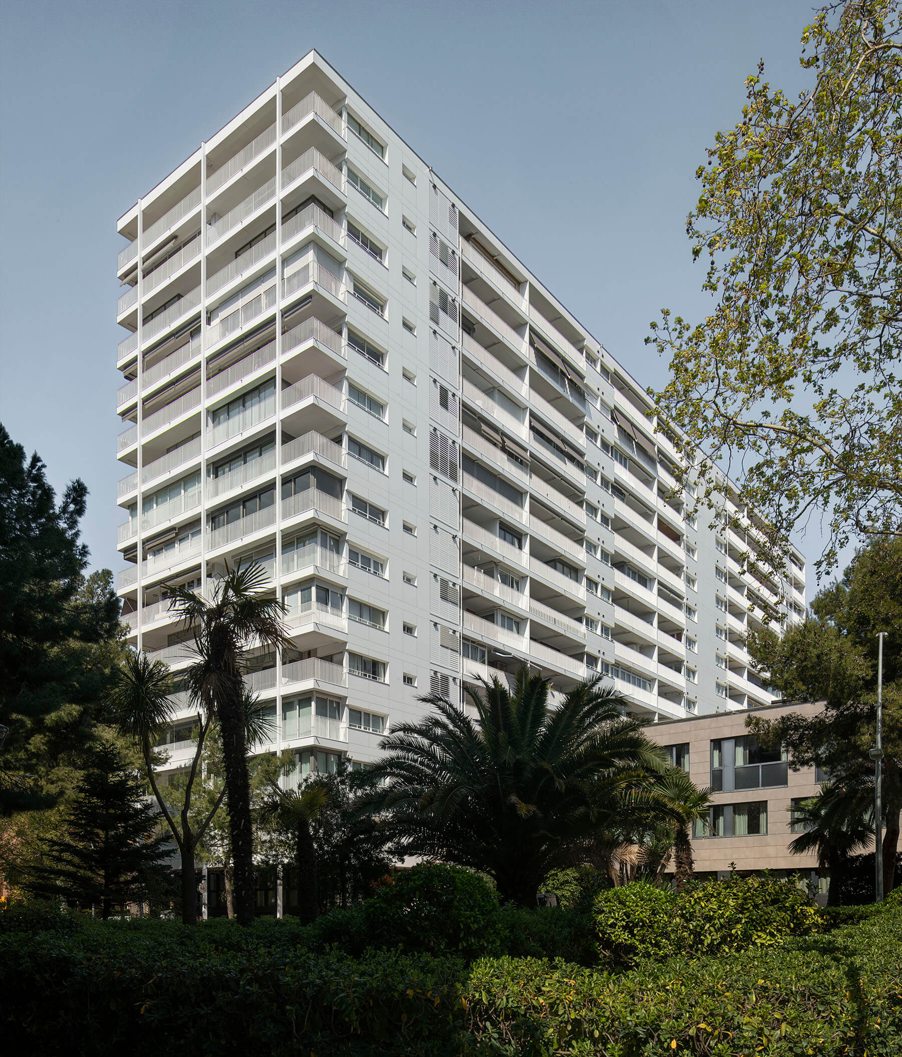 Els dos blocs, de característiques similars, formen part d’un mateix complex residencial dels anys seixanta, separats per una zona comunitària verda amb piscines i àrees de joc. Atenent la natura unitària del conjunt, el projecte manté un criteri formal comú per a tots dos edificis. La nova façana configura un primer pla que defineix i reforça la volumetria dels blocs i el seu especejament racionalista original, emmarcant cada terrassa en un nínxol reculat que unifica el conjunt i difumina les variacions acumulades amb els anys per ocupacions i modificacions particulars.